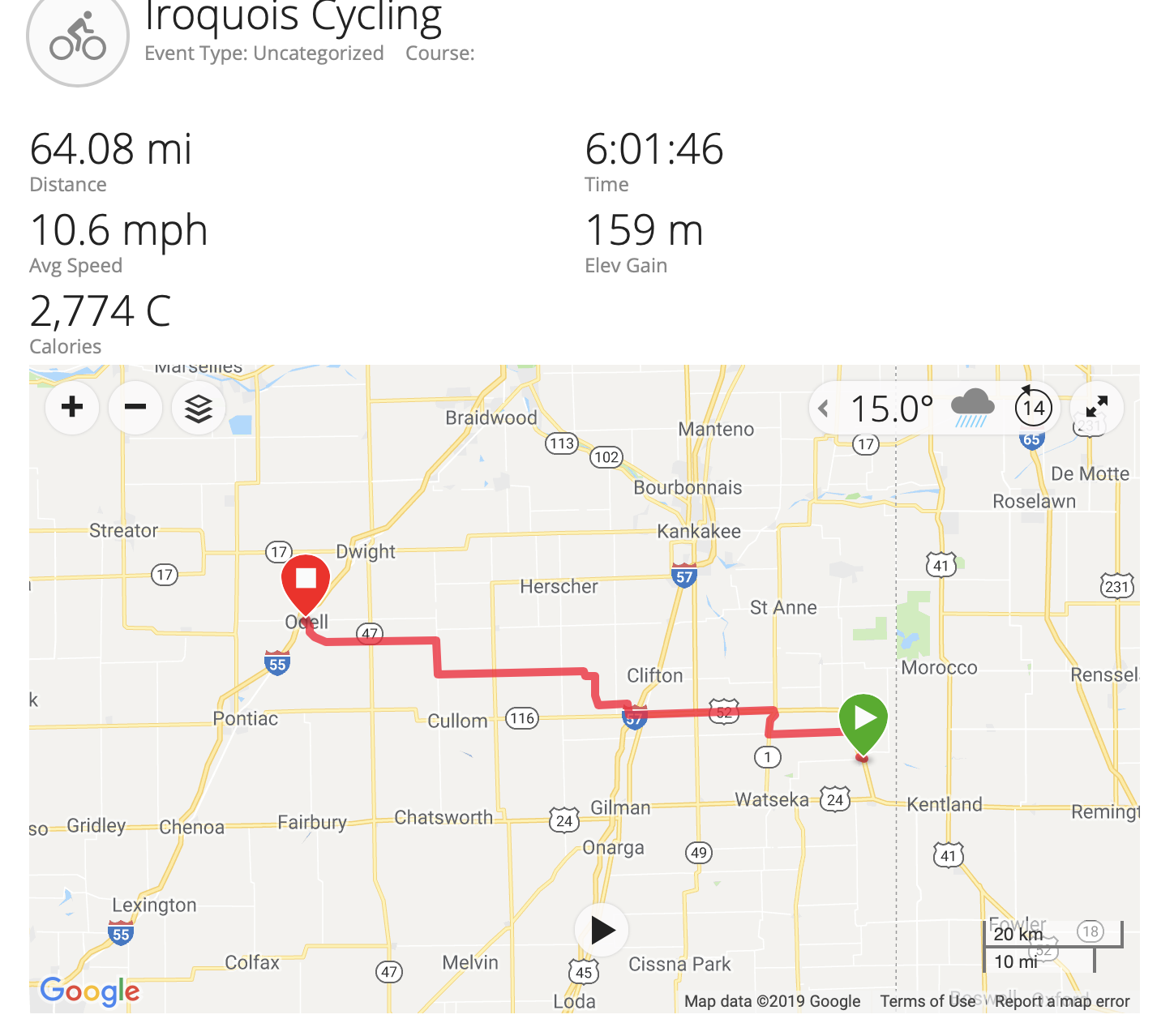 Last night we camped during a monster storm. Enough rain fell that the entire camping area was covered in at least an inch of water; needless to say, everything is soaked. This morning, we started on what was billed as an easy 64 mile day, but the rain continued and a cold wind was coming from the Northwest at about 30 mph; exactly the direction we were biking. There were whitecaps on the lakes that previously were corn fields. On the plus side, there were windfarms throughout the route with the blades rotating faster than I’ve ever seen.
