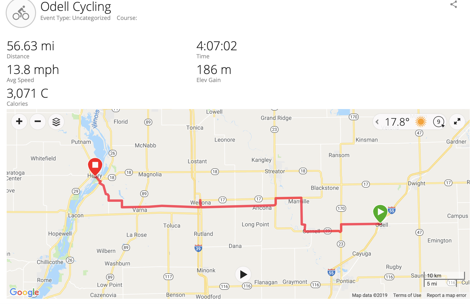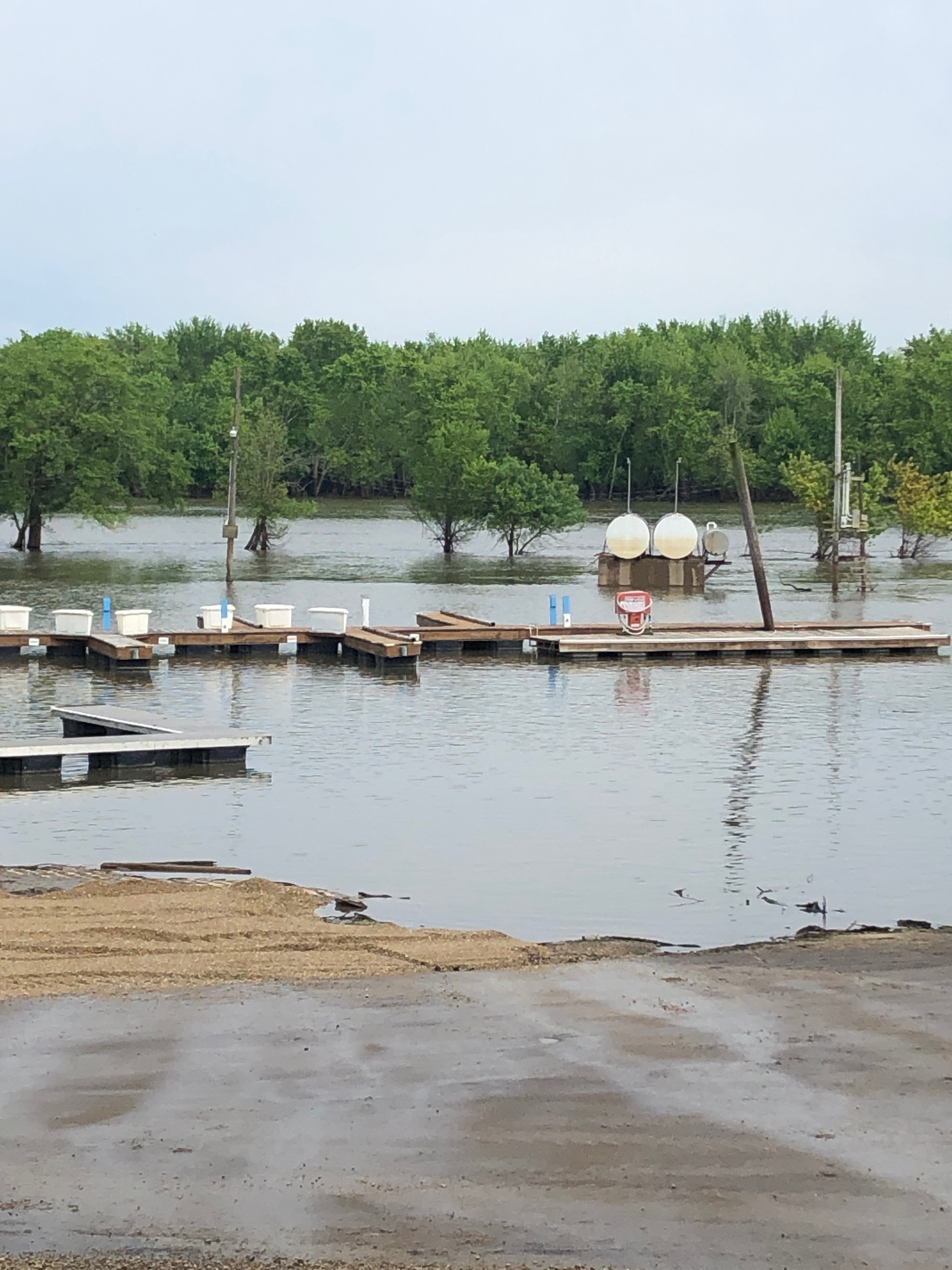 Today we woke to sparkling blue skies, and very little wind. We only covered 56 miles; it was great, and I set a personal record for riding the first 35 miles in less than two hours. We rolled in to Henry quite early, just across the Illinois river. Just as we found our camping spot along the river, the clouds embraced us and we were in another storm. The river just recently fell from flood level; our camping spot was covered in more than 10 feet of water just 3 weeks ago. The banks are still overflowing however, with lots of tees growing out of water, docks partially submerged. I decided to punt and stay in the one motel in town; it too is on the water and was partially submerged; evidence of flooding is everywhere.